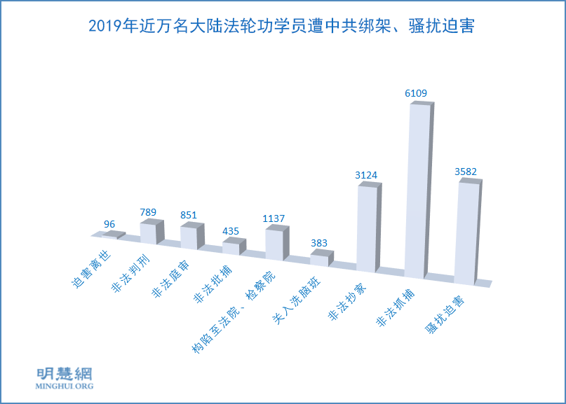 据明慧网信息统计,二零一九年近万名法轮功学员被中共绑架骚扰迫害。其中,非法抓捕6109人次(2709人已经回家),非法骚扰3582人次,强制送洗脑班383人,抄家3124人次,离家出走91人。中共冤判789名法轮功学员,非法庭审851场,非法批捕435人,构陷到检察院、法院1137人。有10法轮功学员依法控告、起诉中共迫害法轮功元凶江泽民被非法抓捕。