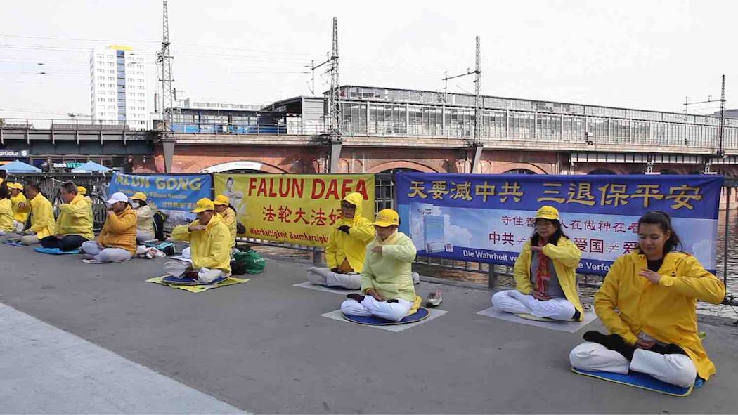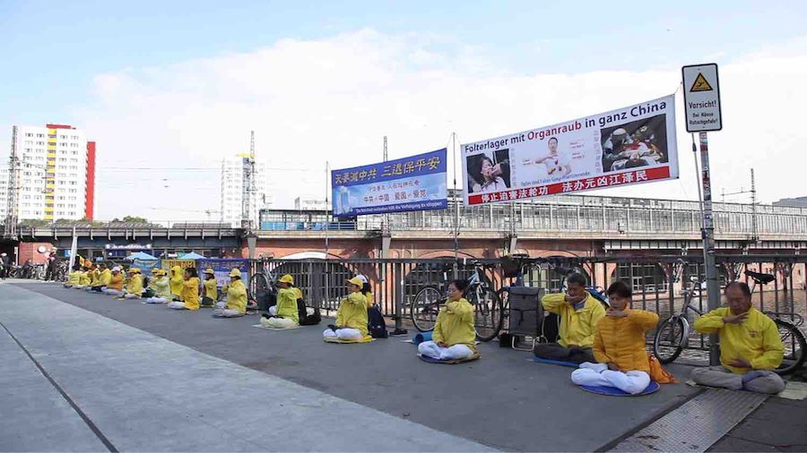 十月一日,德国首都柏林的法轮功学员在中共大使馆对面,静静地展示功法,揭露中共对法轮功长达二十一年的迫害。并向过往的路人介绍法轮功的美好和中共迫害的事实。
