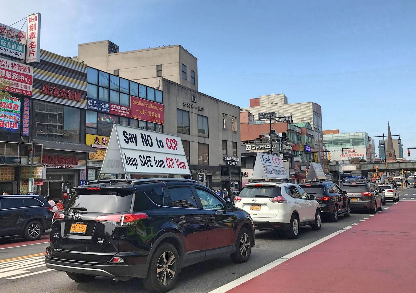 浩浩荡荡的车队从法拉盛出发,行经著名的大都会艺术博物馆、中央公园、美国自然历史博物馆和时代广场等景点,再到纽约中领馆前绕行,最后回到法拉盛缅街市中心。车顶上的中英文大型展板美观大方,醒目明确,上书“中共是真正的病毒源头”、“中共撒谎、人民死亡(CCP Lies, People Die)”、“Say NO to CCP, Keep SAFE from CCP Virus”(拒绝中共, 远离病毒)、“Communism puts everyone at risk”(中共把每个人都陷于危险之中)、“真善忍、法轮大法好”等,向广大民众传递着真相。