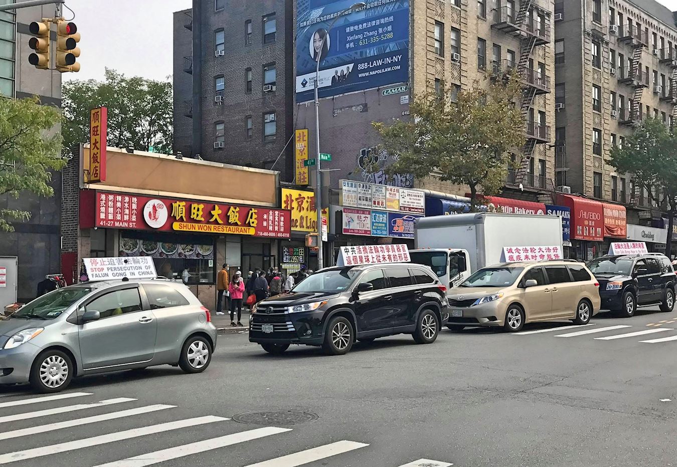 '图7~10:“解体中共”真相车队途径法拉盛主要街道'