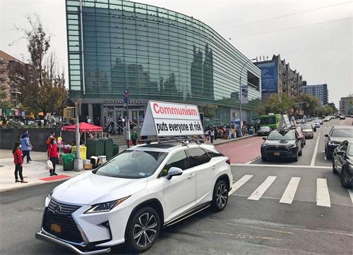 【明慧网二零二零年十月十六日】十月的纽约,秋高气爽,阳光和煦,二零二零年十月三日和十日,二个周末,“全球退党服务中心”都有几十辆头顶各式“解体中共”真相展板的汽车组成车队巡游,从法拉盛出发,环绕曼哈顿市区中心,再巡回到法拉盛缅街市中心。真相车队巡游吸引了民众眼球,不少行人拍照,还有西方人从副驾驶座位上探出身来拍照。有司机向车队大喊:“加油!”在等红灯时很多次行人向司机们竖大拇指,表示支持和鼓励。