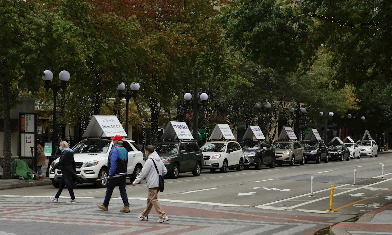 黄瑞秋说:“我们12点多出发,先在中国城转了几圈。很意外,当时中国城人很多,车队停下来时,就会有人索要真相资料,小莲花也很受欢迎。当时印象比较深的是四个男学生样子的亚裔,背着相机,不停向我们竖大拇指;还有一位长者,手举《大纪元》报纸,不断向我们挥舞,生怕我们没看到他;到西雅图市中心时,看到很多西人拿出手机拍照。”