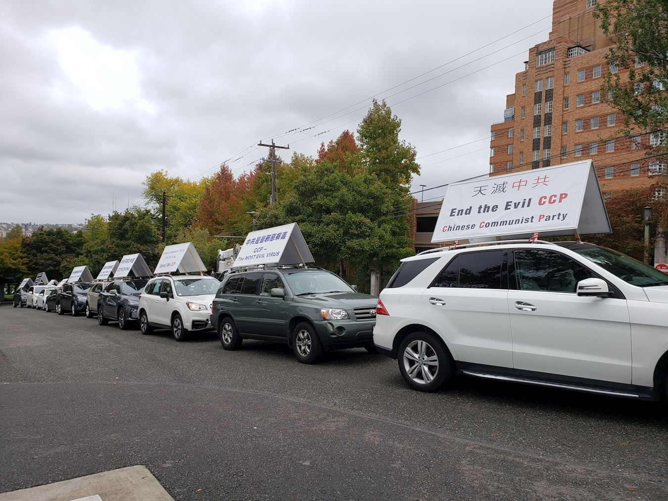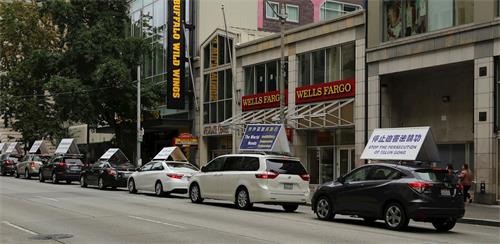 法轮功学员的车队在车顶安装了各种标语牌,例如:“远离中共、远离病毒”、“停止迫害法轮功”、“中共撒谎、人民死亡”、“法轮大法洪传一百多个国家”、“中共是最邪恶的病毒”、“中共不等于中国”、“制止中共活摘器官”,在车队排好、整装待发,适逢市政府几辆车路过,向学员的车队鸣笛致敬。