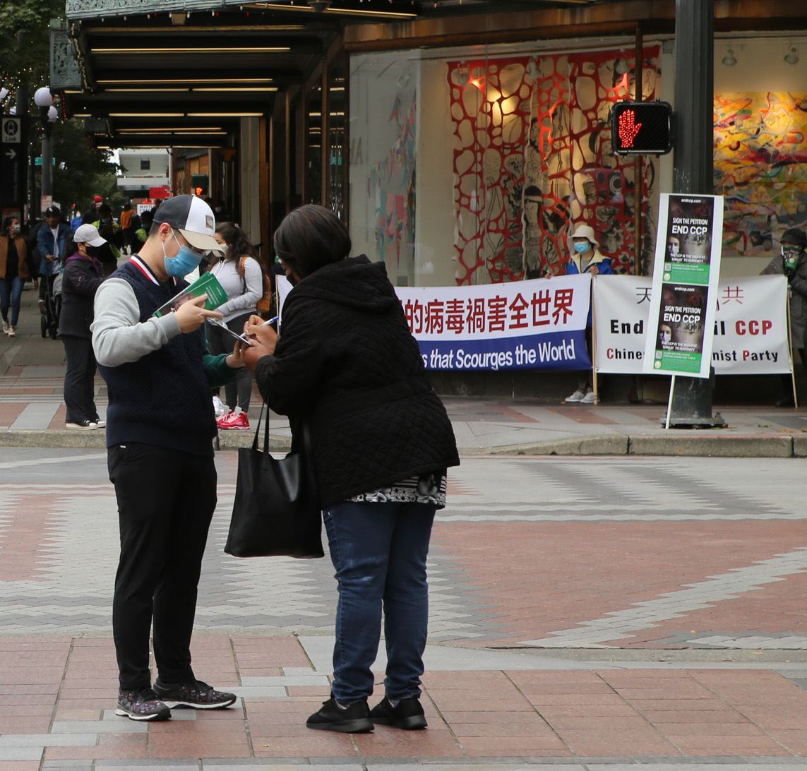 西雅图是著名的雨城,全年除了夏天三个月无雨之外,基本另外三季都会有不同程度淅淅沥沥的阴雨。但无论晴雨,西雅图的法轮功学员一到周末就会集体来到不同城市市中心和繁华地带,拉起横幅,发传单、讲真相,并为“终结中共”而征签,也会有真相车队的游行。
