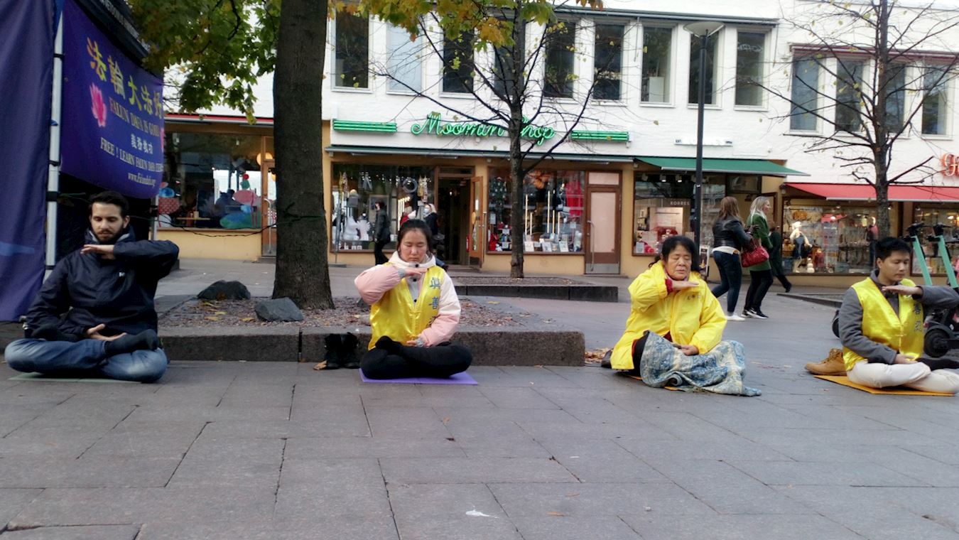 图1:芬兰法轮功学员来到了赫尔辛基市中心展示法轮功功法