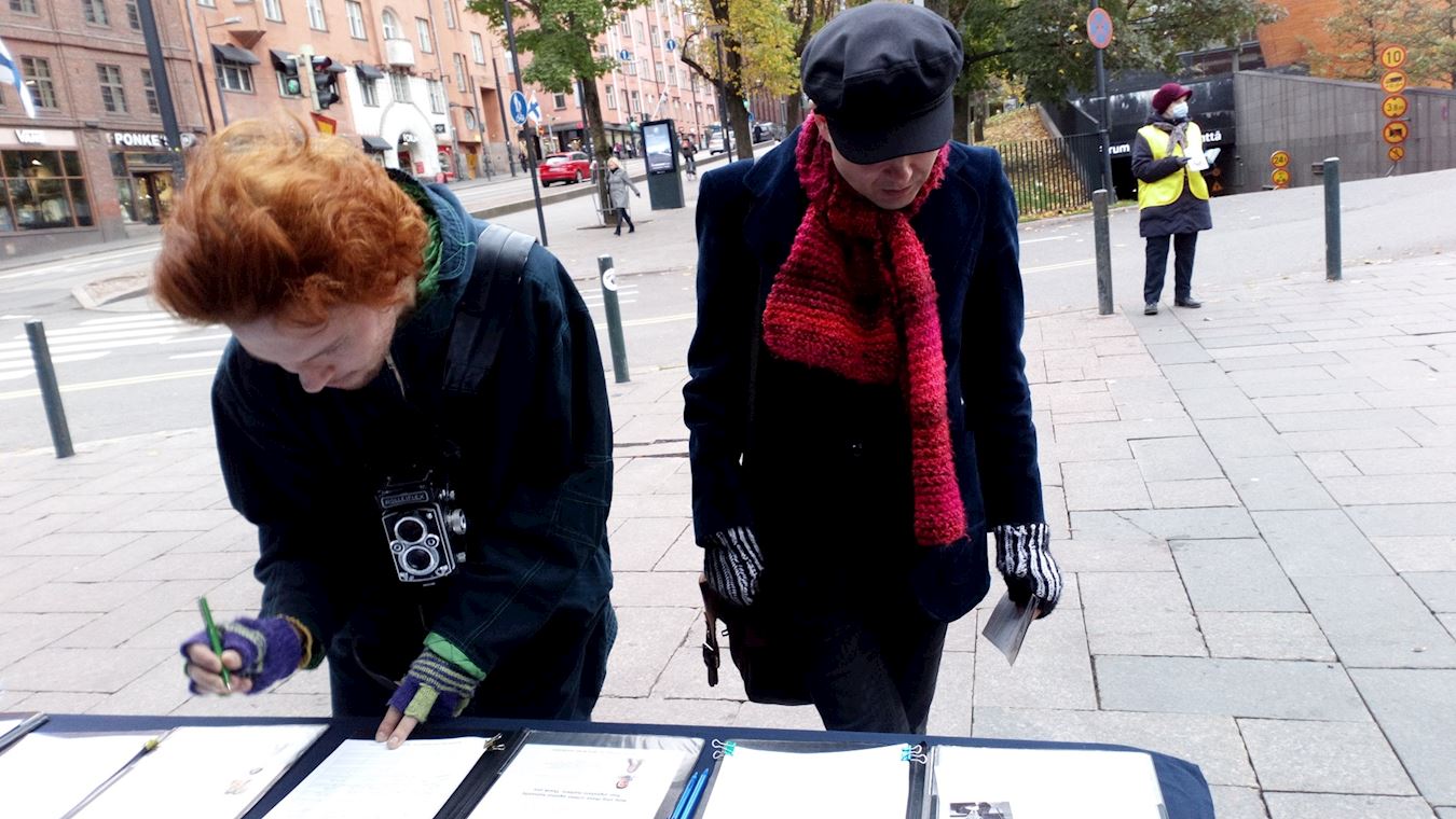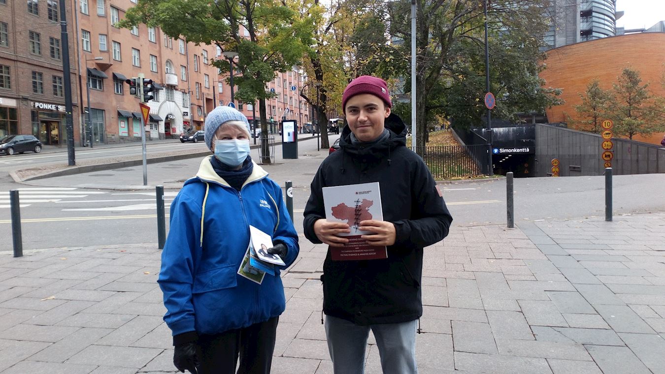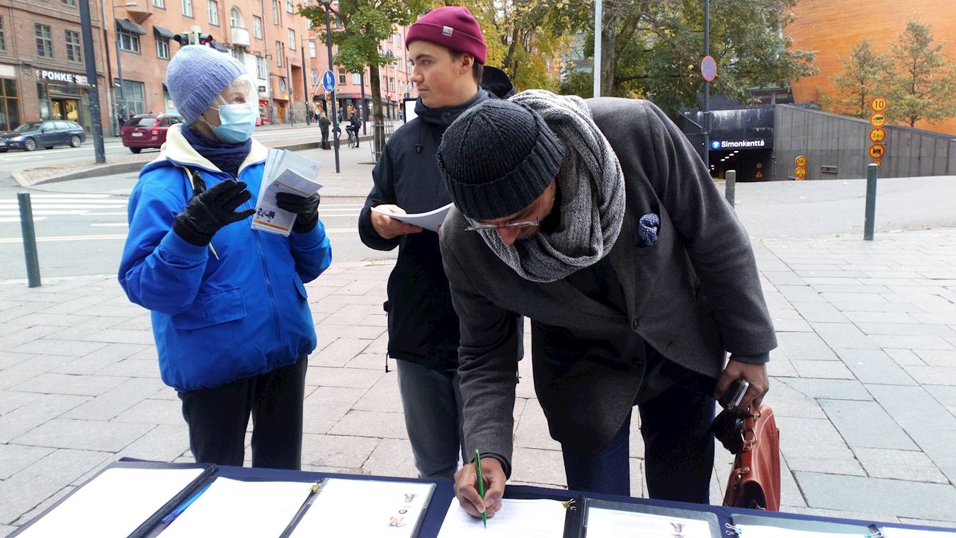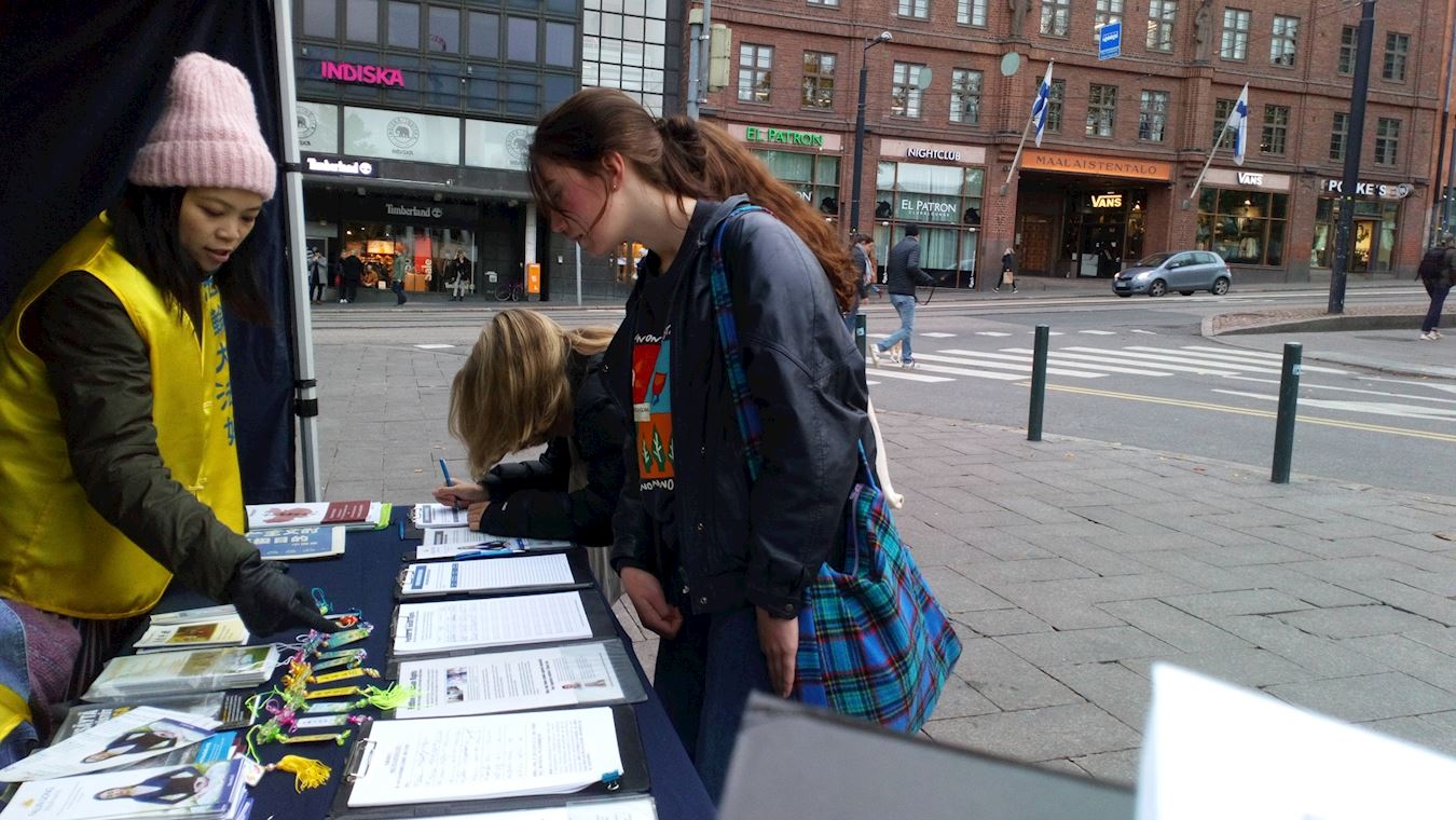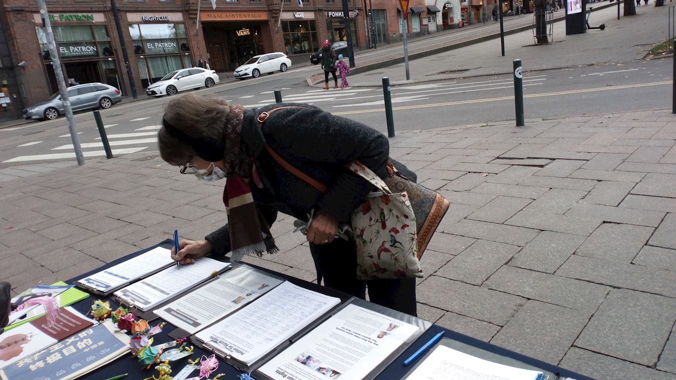 【明慧网二零二零年十月二十九日】二零二零年十月二十四日,星期六,芬兰法轮功学员来到了赫尔辛基市甘比(Kampi)购物中心附近架起了法轮功真相帐篷,告诉过往的市民们法轮功“真善忍”的美好和长达二十一年残酷迫害法轮功真相。很多路人纷纷过来签名,并告诉学员:“你们做了一件很重要的事情。”