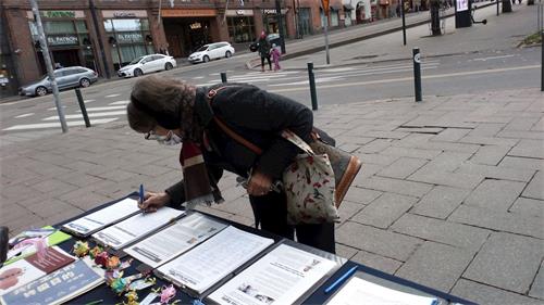 克里斯汀(Kristin)与先生从挪威来芬兰旅游。她与学员谈到中共在北欧国家干的一些恶行。他们非常了解中共的本质,并马上表示签名支持法轮功反迫害。