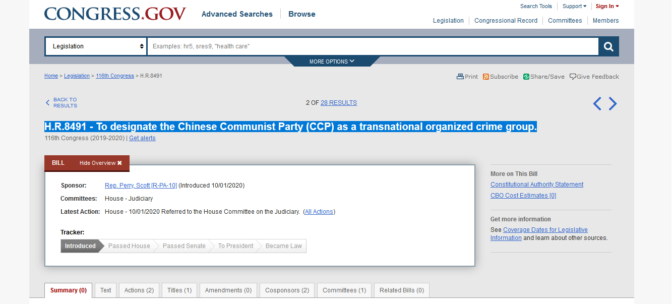 ![]() 图1:2020年10月4日,美国众议院推出一项法案(H.R.8491)——将中国共产党指定为跨国有组织犯罪集团(To designate the Chinese Communist Party (CCP) as a transnational organized crime group)。(美国国会网络解图) |