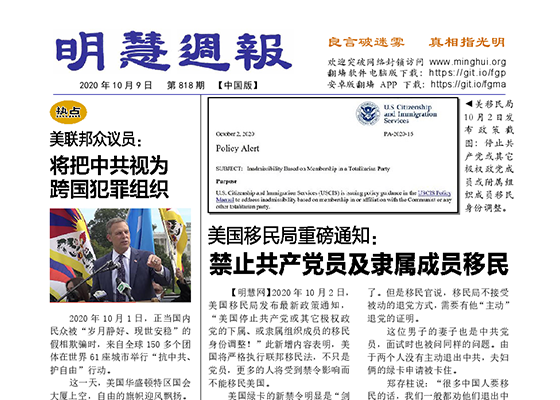 二零二零年十月二日,美国公民及移民服务局(USCIS)公布最新措施,禁止中国共产党及其附属组织的成员移民美国。