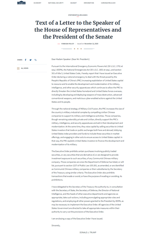 “根据《国际紧急经济权力法》(50 USC 1701等)(IEEPA),《国家紧急状态法》(50 USC 1601等)以及美国法典第3编第301条,我在此报告,我已颁布一项行政命令,宣布进入全国紧急状态,以应对中国(中共)越来越多的开发和利用美国资本作为他们的资源,实现他们军队、情报和其它安全机构的发展和现代化。他们这些举动使得中国能够直接威胁美国国土和在海外美军。其中包括通过开发和部署大规模毁灭性武器、先进的常规武器以及针对美国及美国人民的恶意网络攻击。