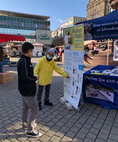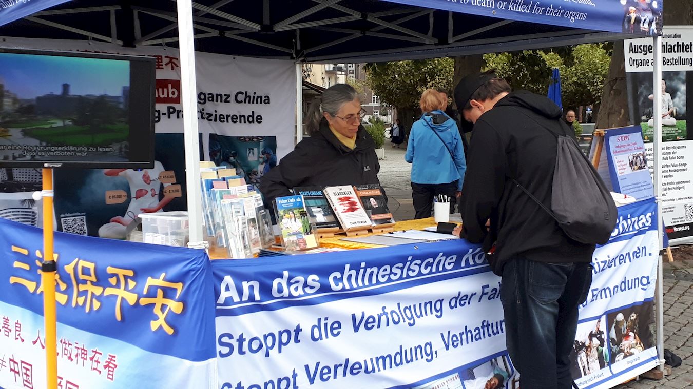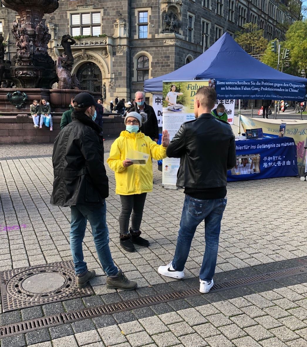 杜赛尔多夫(Düsseldorf)是北威州首府,多年来几乎每个周末当地及周边地区的法轮功学员都会聚集到古城中心如城堡广场(Burgplatz)等地举办讲真相活动。这里是民众乐于和亲朋好友闲时聚会的地点。十月份以来,很多人对法轮功学员说:“你们为这件事(反迫害)尽力,这非常好。”一位年轻女教师了解到真相点的法轮功学员都是义务服务时,对学员说:“你们太伟大了。”也有人看到学员打坐炼功后主动了解什么是法轮功,并表示他们也相信精神层面的提升是很重要的。很多人为反迫害签了名。