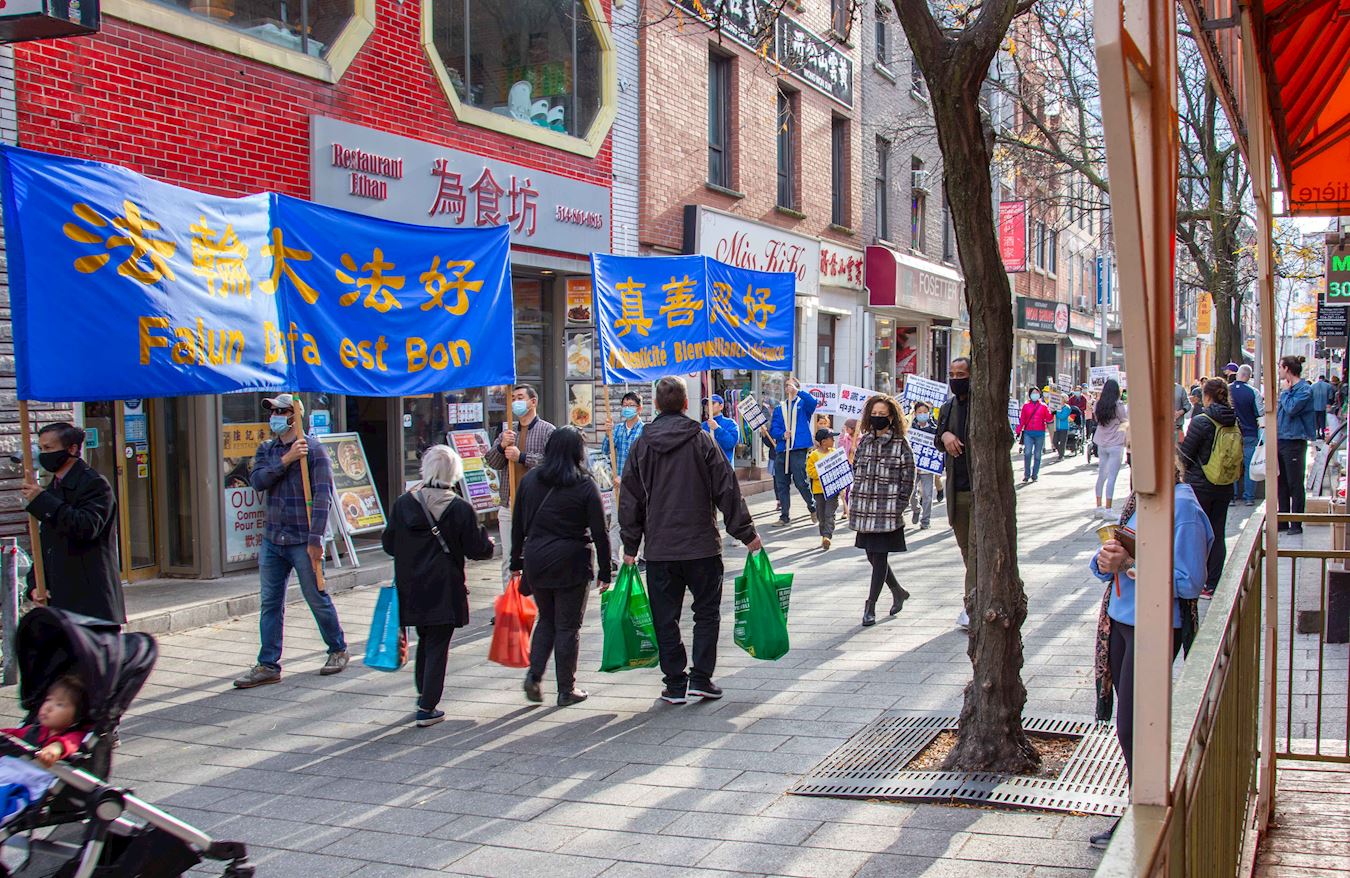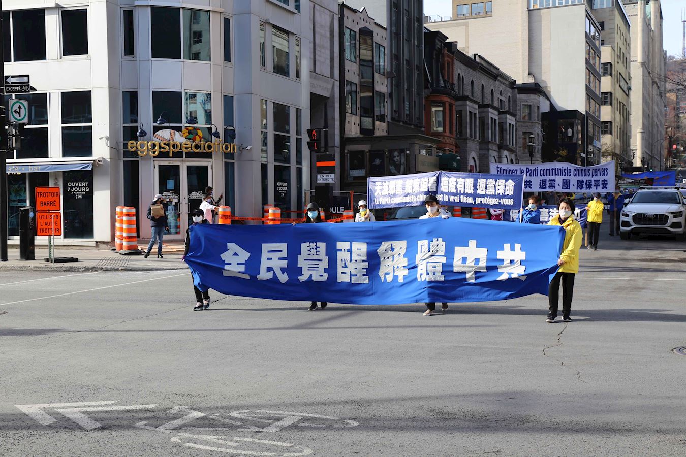 队伍缓缓行进,一幅幅中、英、法文组成的横幅展现在人们面前:“庆祝3.6亿中国人退出中共党团队组织”、“Le PCC ment Les Canadiens Meurent(中共撒谎让加拿大人付出生命代价)”、“停止活摘器官”、“Le Parti communiste chinois a blamer pour la pandemie(中共是大流行病的祸因)”、“停止迫害法轮功”、“天灭中共”等。