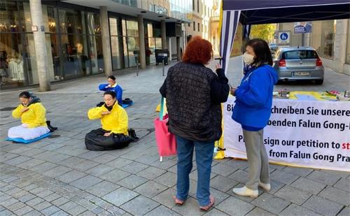 德国小伙子扬(Jan)主动走到信息台签名,法轮功学员问他是否知道为什么签名,他说:“横幅上不是写的很清楚吗?”学员说:“写的是很清楚,我再给你一份传单,上面有更详细的信息。” 扬认真的收好传单说:“这样的事(活摘法轮功学员器官)不应该发生!”