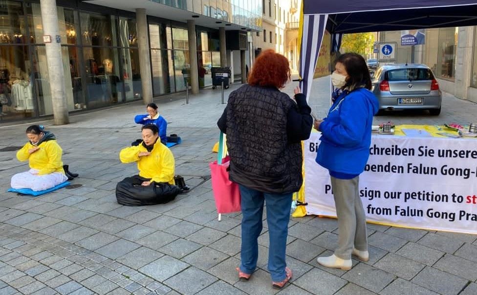 当古奇女士(Gutsche)和儿子看到信息台桌子前面的横幅“请签名制止活摘法轮功学员的器官”,禁不住停下脚步,认真阅读起展板上的信息。