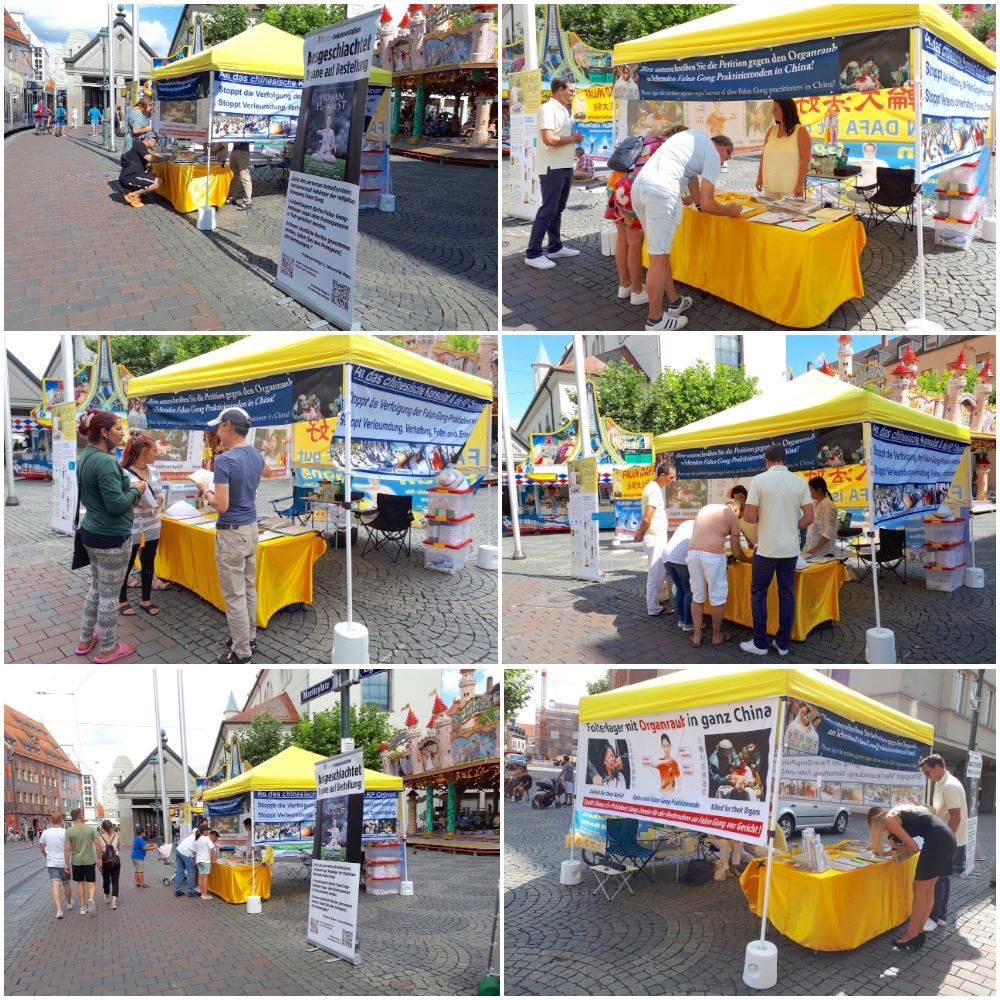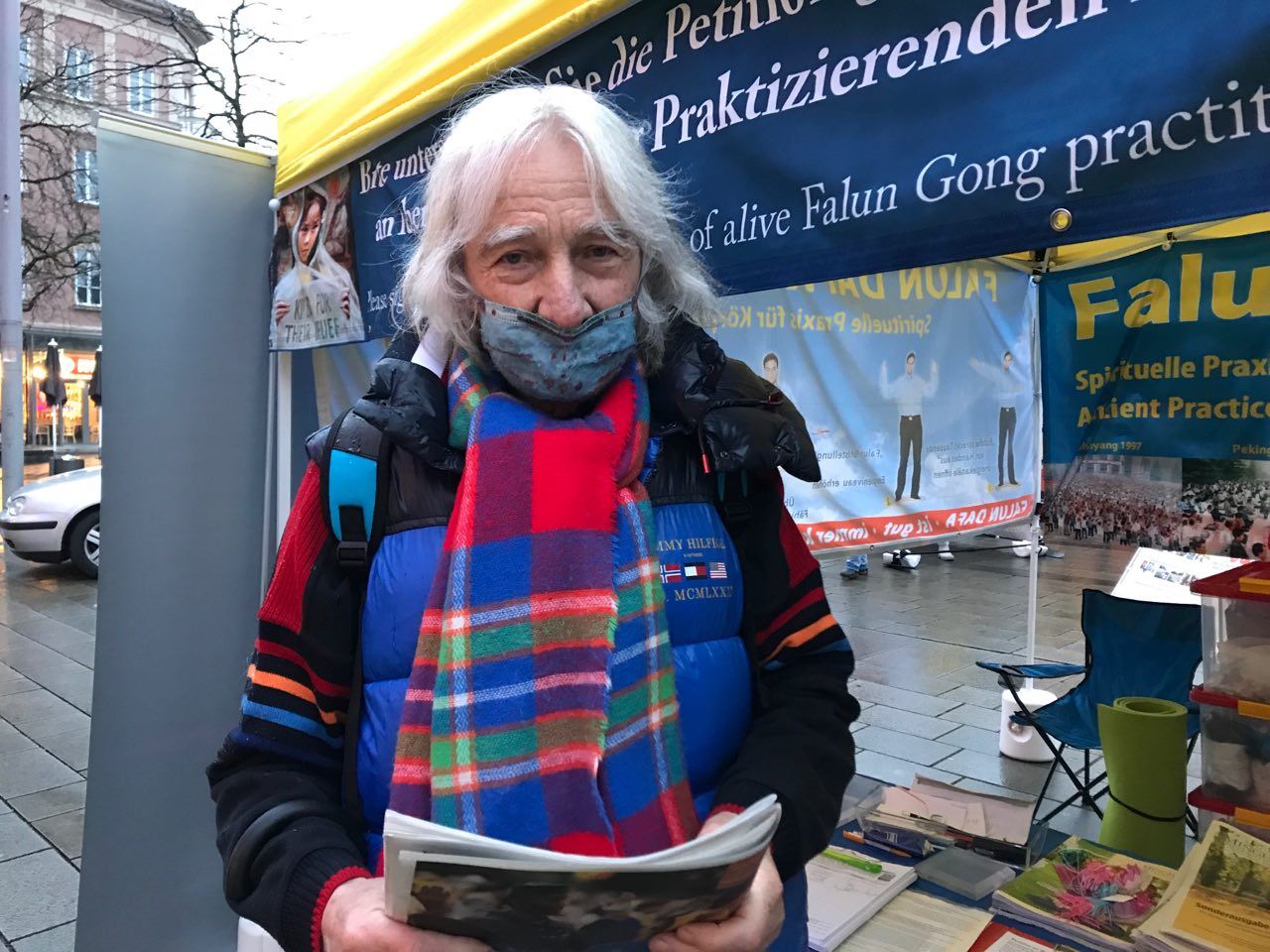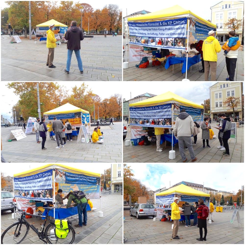 十二月五日,法轮功学员在奥格斯堡市中心国王广场(Königsplatz)搭起帐篷游、拉起大型横幅和图片,揭示中共对法轮功学员的迫害。寒风细雨中,学员们的功法演示吸引着路人的目光,人们停下脚步跟法轮功学员交谈,了解中共为什么要迫害法轮功,法轮功是什么,明白了真相的人纷纷声援法轮功学员反迫害,在给德国政府的请愿书和解体中共的连署上签名。
