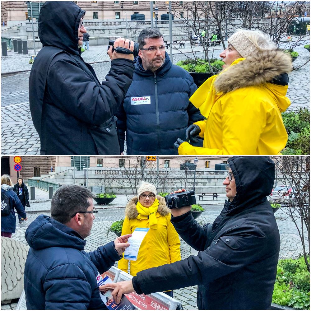 十二月十八日周五,来自瑞士法语区一家电视台的两位先生,路过活动场地时,看到法轮功学在办活动很高兴。他们表示非常关注中共对法轮功、西藏、新疆等多个团体的迫害。学员递上法语的大法真相传单。于是两人在现场就开始用法语录制介绍法轮功以及在中国正在发生着残酷迫害的节目,还对法轮功学员进行了采访。