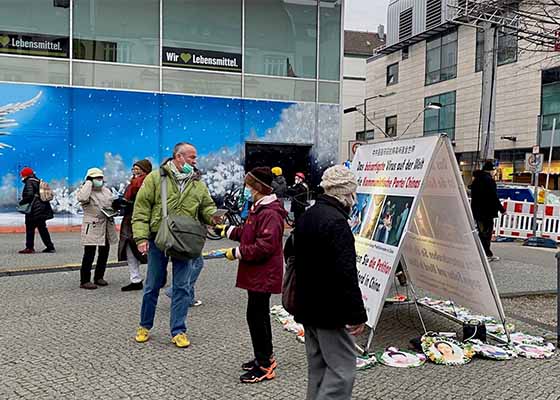 二零二零年十二月五日,德国柏林法轮功学员在斯特格利茨城区的圣诞市场,向民众传播法轮功在中国被迫害的真相。