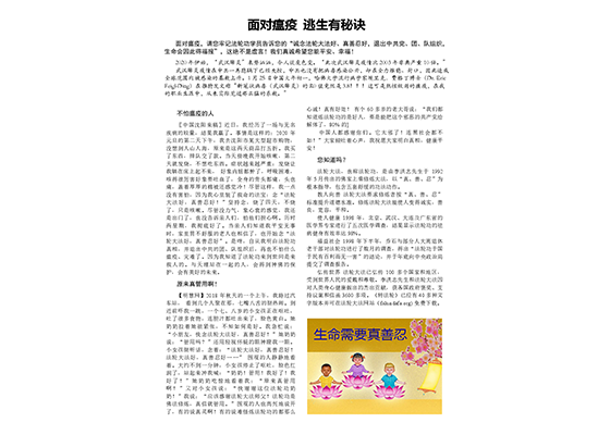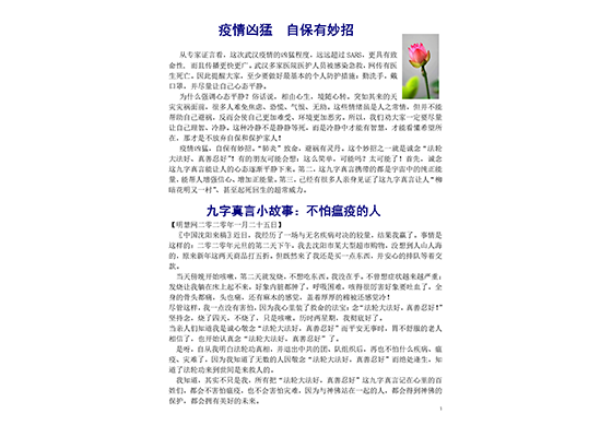 面对瘟疫,请您牢记法轮功学员告诉您的“诚念法轮大法好、真善忍好,退出中共党、团、队组织,生命会因此得福报”,这绝不是虚言!我们真诚希望您能平安、幸福!