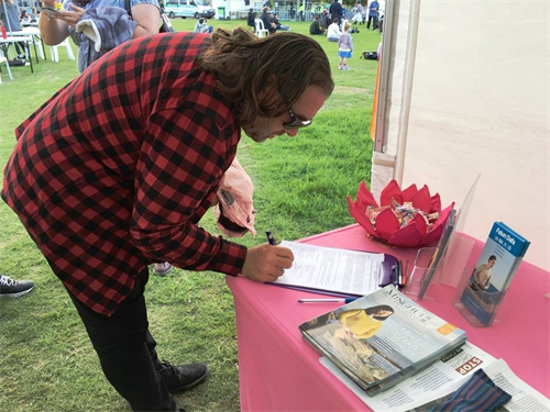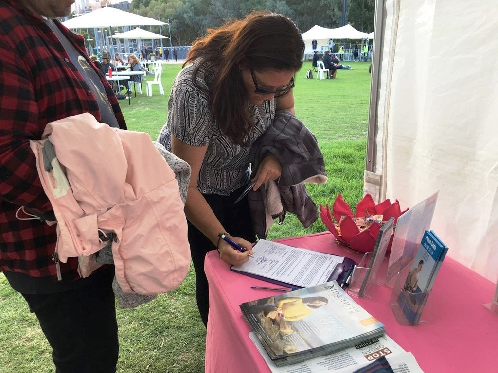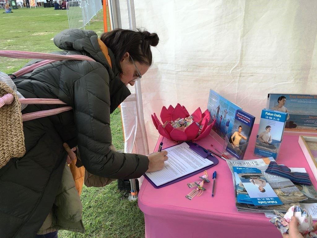 中国法轮功学员为了坚守信仰反迫害的真相让她动容,她在签名表上签下了名字,希望澳洲政府能帮助制止迫害,并非常感激索菲亚和其他法轮功学员分享这些信息,“迫害是错误的,并且持续了这么长时间(超过二十年),从此,绝不会再听信或被这样的政权欺骗了。”
