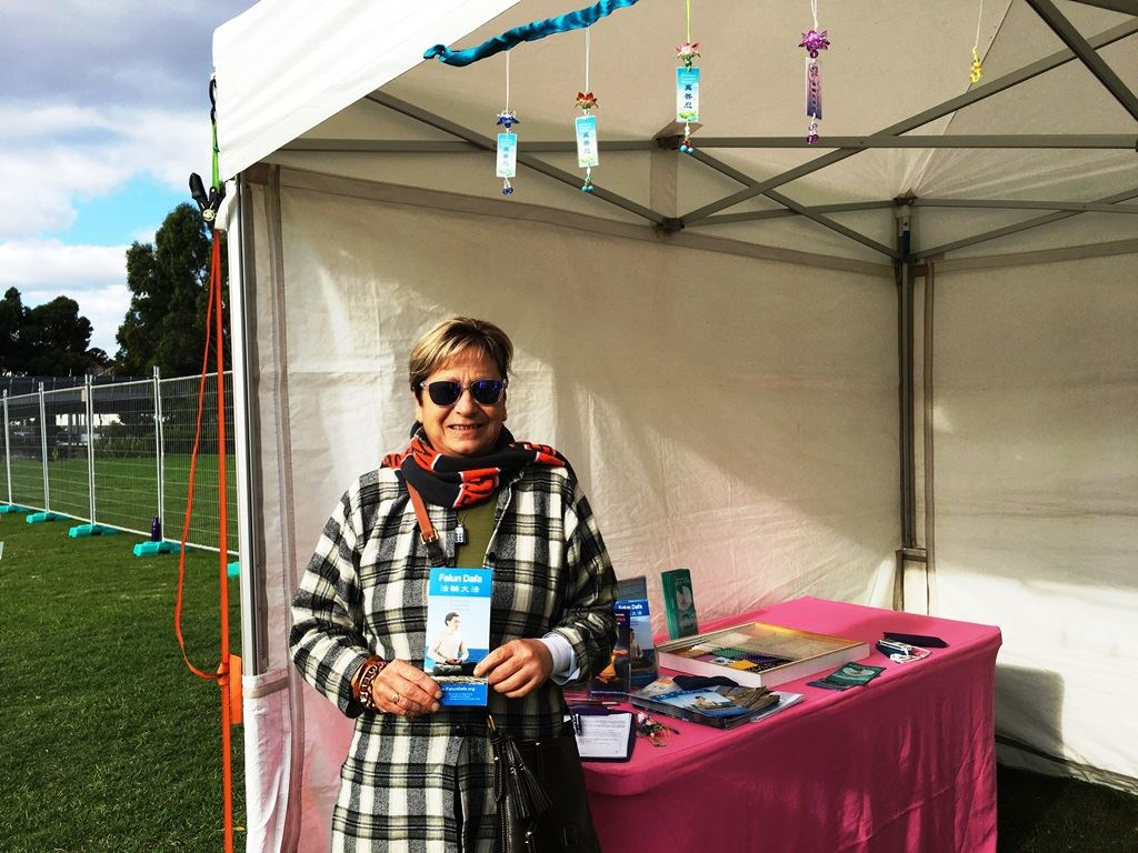 修炼八年来,无论是在家乡希腊、旅居英国还是定居墨尔本,索菲亚利用各种机会洪扬法轮大法。在当天的艺术节上,她热情接待着每一位游客,分享自己的故事,讲述法轮功学员二十年来的反迫害历程。