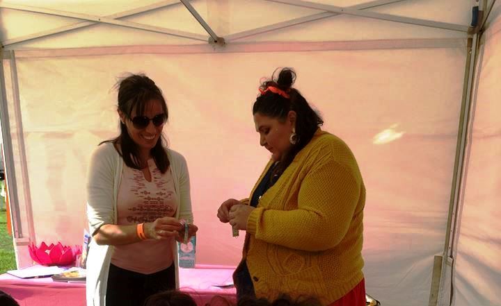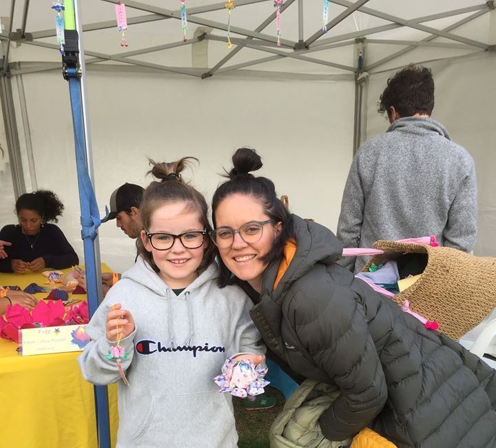 图8:在法轮功的摊位里,参加文化节的家长和孩子通过制作莲花了解到法轮功的真相,每一个小莲花挂件都有护佑平安的真言“法轮大法好”“真善忍”。图为亲自制作了莲花和小莲花挂件后非常开心的家长和孩子。