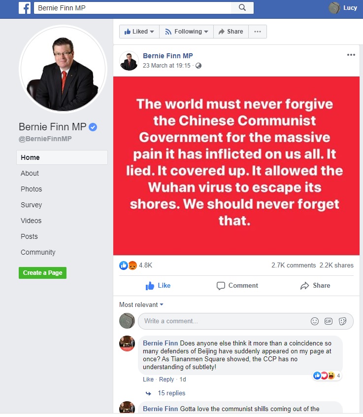 ![]() 图2:澳大利亚维州立法委员会成员斐恩(Bernie Finn MP)2020年3月21日的脸书帖文。中文翻译:“中共政权不是澳大利亚的朋友。它这次确实努力的证明了这一点。我们永远不应该再相信或信任它!” |