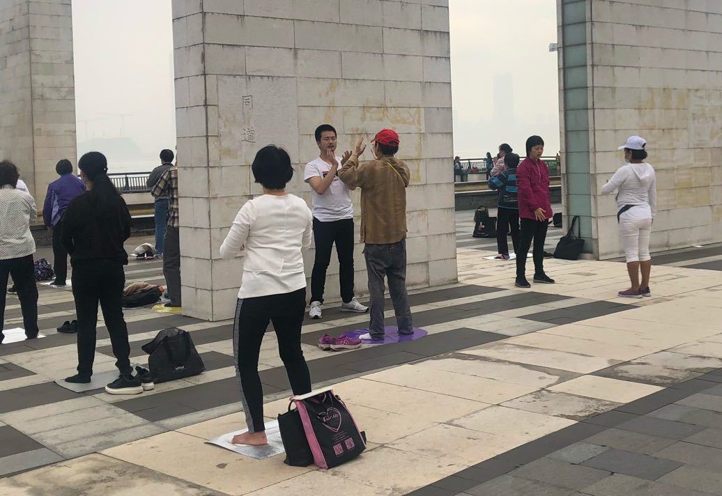 '图2:集体炼功现场有民众来学炼法轮功。'