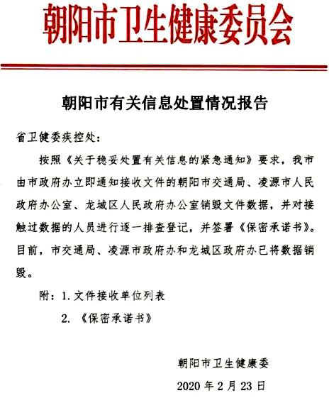 日前,一份朝阳市卫健委2月23日发给辽宁省卫健委的内部文件流出,内容是该市政府办公室已按照《关于稳妥处置有关信息的紧急通知》的要求,通知下属朝阳市交通局、凌源市政府办公室、龙城区政府办公室销毁有关新冠疫情的文件数据,并对接触过数据的人员逐一排查登记,要求其签署《保密承诺书》。对疫情有关数据的“稳妥处理”的要求,使辽宁省政府掩盖疫情实况的举动暴露无遗。