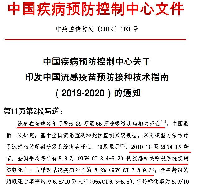 ![]() 图4:中国疾控中心文件:全国每年流感超额死亡(相关呼吸道疾病,超过预计人数为)8.8万人 |