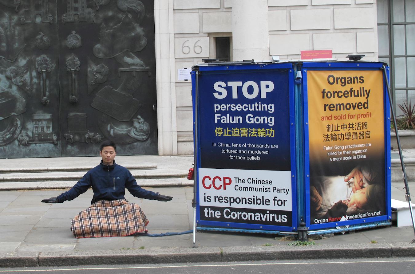 图1:二零二零年四月二十五日,法轮功学员在伦敦中使馆前的对面街道上和平请愿,纪念上万名法轮功学员和平上访二十一周年,同时传播法轮功的真相。