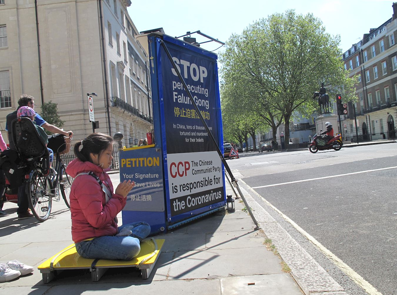 实际上,从三月二十四日英国开始实施社会隔离、禁足令后,伦敦的法轮功学员也相应调整改变了他们在伦敦中使馆前和平理性反迫害的方式,每天有两位法轮功学员前来中使馆前炼功。他们还重新安装和改造了原来的太阳能照明,以保证真相展板的夜间照明,从而保证在真相点前经过的人总能有机会看到醒目的中英文信息:“停止迫害法轮功”、“制止中共活摘法轮功学员器官”,看到用六种文字书写的“真善忍”,看到用英文介绍的“什么是法轮功”、“中共为什么迫害法轮功”等基本真相信息。