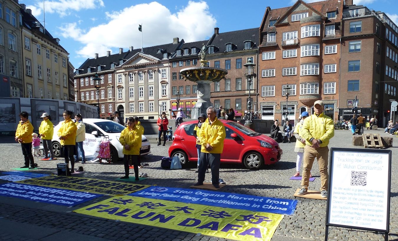 ![]() 图1:丹麦法轮功学员在哥本哈根的老广场炼功,讲真相。 |