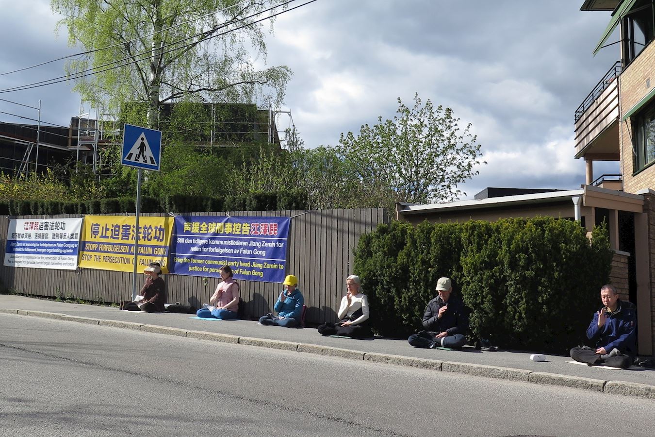 挪威法轮功学员在过去的二十一年中不断地在中使馆前抗议中共对法轮功的迫害,要求中共立即停止迫害法轮功,法办迫害元凶江泽民,还中国大陆法轮功学员自由的修炼环境。中使馆附近的居民见证了法轮功学员这些年来的反迫害活动,一些过往车辆的司机和行人看到法轮功学员时竖起了大拇指。