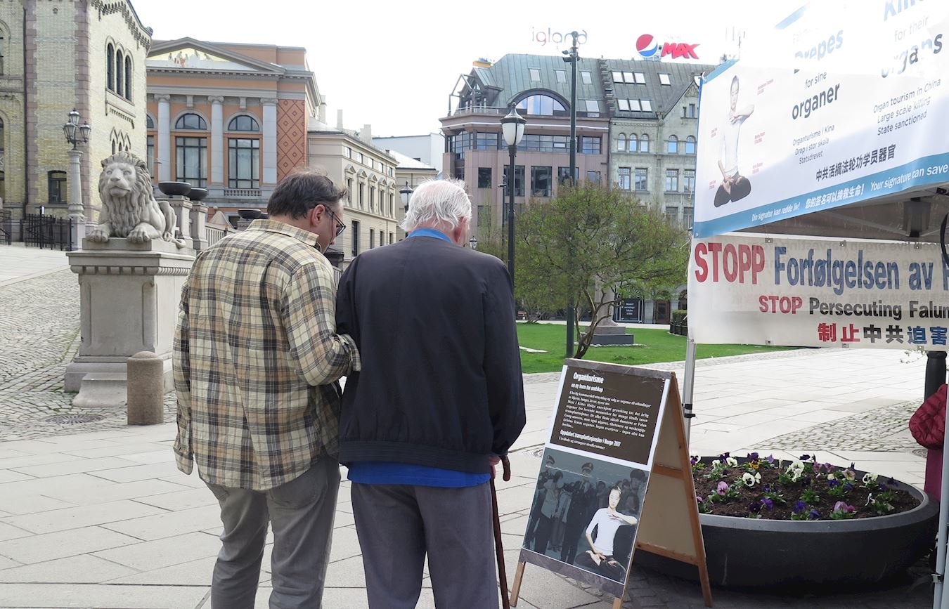 住在奥斯陆的汉斯(Hans G.)和他的朋友到市中心散步,他们认真阅读了有关中共活摘法轮功学员器官的信息。他对学员说:“我明白了。修炼法轮功的人身心健康,他们的器官有活力。中共迫害法轮功,他们把法轮功修炼人的器官拿去卖大价钱,赚更多的钱。这实在是邪恶,令人作呕!” 汉斯在呼吁书上签了名,他希望能帮助制止这种野蛮行径。