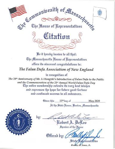 麻萨诸塞州众议院向新英格兰法轮大法学会致以最衷心的祝贺!