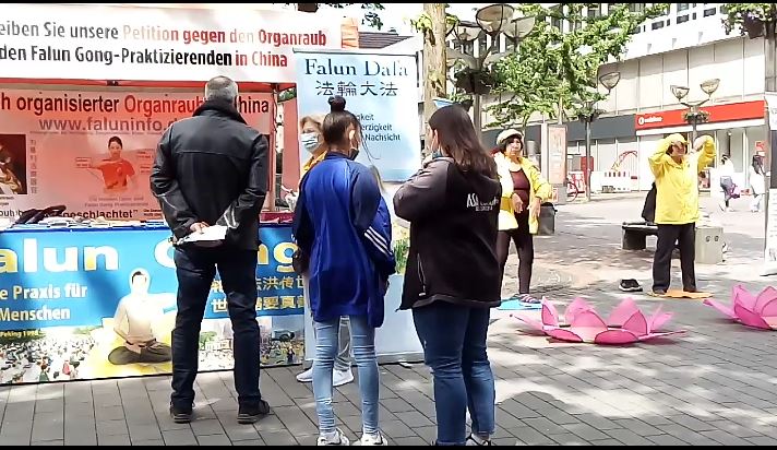 【明慧网二零二零年五月二十六日】二零二零年五月二十三日星期六,德国北威州部份法轮功学员在杜伊斯堡市(Duisburg)中心,举办了反迫害讲真相活动。这是中共病毒肆虐全球,德国也深受其害,禁足两个月。五月德国疫情缓慢走低,中旬有限解禁。这次讲真相的活动也是解禁后的第一次信息日活动。