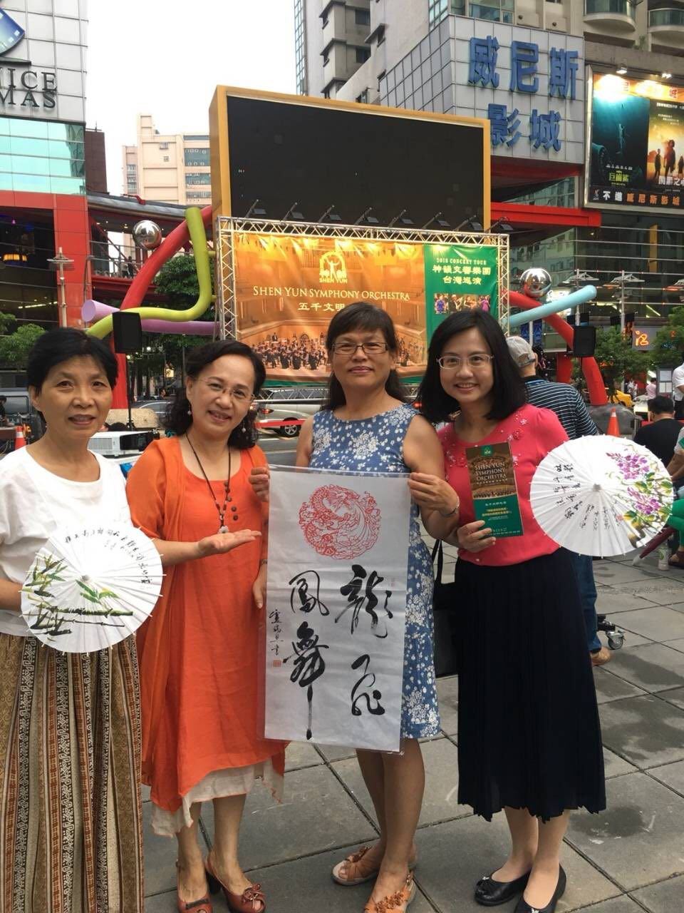 ![]() 图2:刘明辉的妻子(左二)是书法家,在神韵推广活动中,现场挥毫的作品致赠给购票的民众。 |