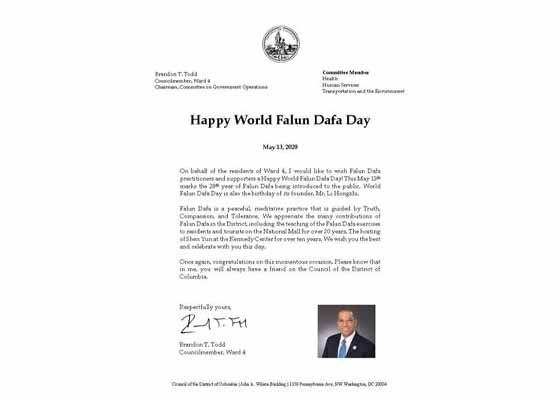 美国首都华盛顿议员、政府运作委员会主席布兰顿·托德致信庆贺“世界法轮大法日”,感谢法轮大法为美国首都华盛顿带来的许多贡献。