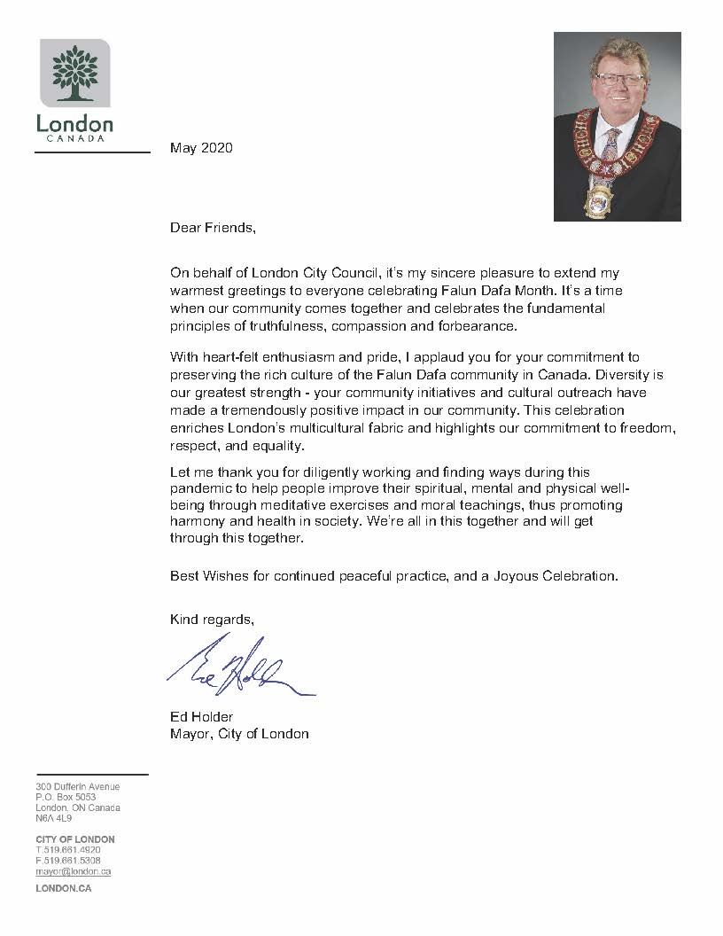 伦敦市市长埃德·霍尔德在贺信中说:我很高兴代表伦敦市议会,诚挚地向庆祝“法轮大法月”的所有人致以最热忱的问候。这一时刻,让我们的社区共同庆祝“真、善、忍”的基本原则。