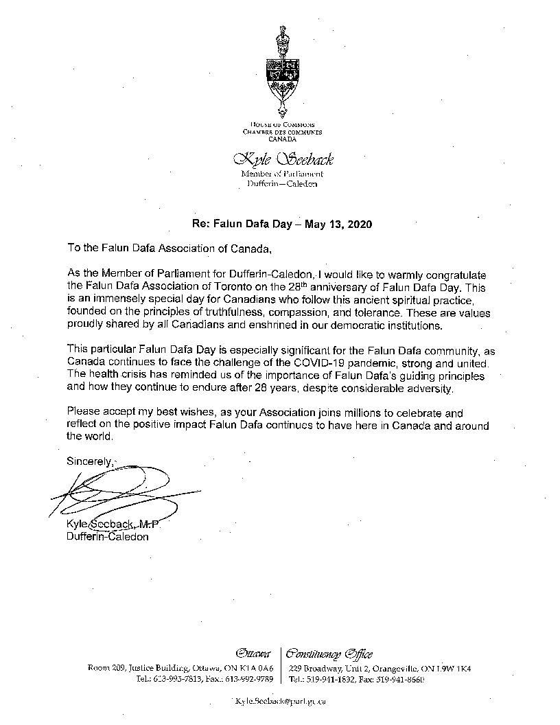 国会议员凯尔·塞贝克(Kyle Seeback)在贺信中说:作为Dufferin-Caledon 选区的国会议员,在法轮大法洪传28周年纪念日即将到来之际,我谨向多伦多法轮大法协会表示热烈祝贺!对于加拿大追求真善忍的法轮大法修炼者,这是一个伟大的日子。真善忍也是我们所有加拿大人追求的普世价值,也是对加拿大民主制度的奉献。