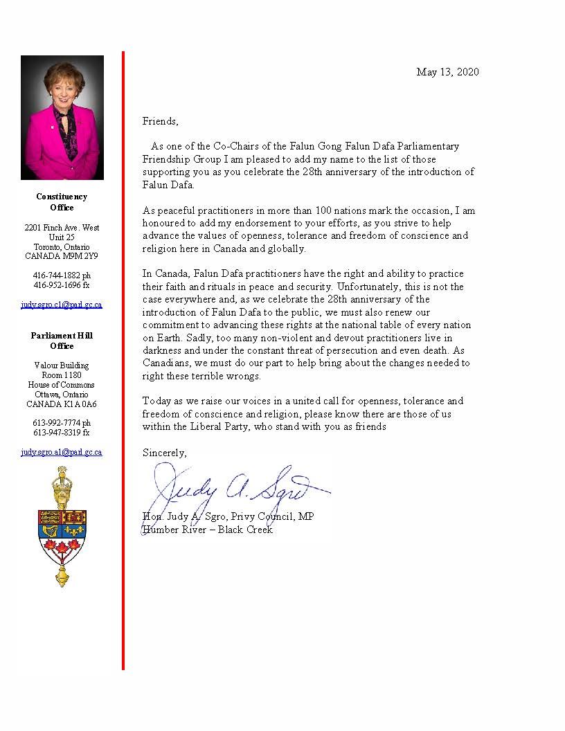 每年都写来贺信的国会议员朱迪·格罗(Hon. Judy A. Sgro)的贺信写道:朋友们,作为法轮功之友联合会主席之一,我很高兴将我的名字添加到法轮功支持者的名单中,让我们共同庆祝法轮大法洪传世界28周年。