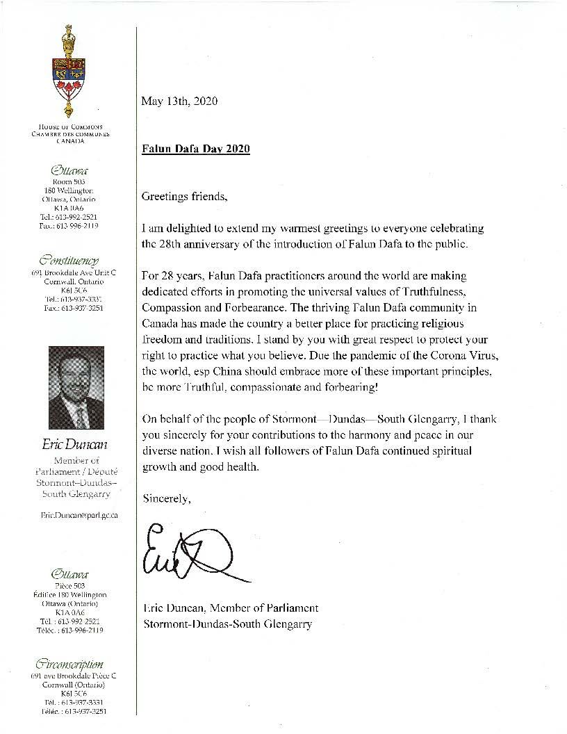 国会议员埃里克·邓肯(Eric Duncan)的贺信说:朋友们好,谨向所有庆祝法轮大法洪传28周年的大法学员致以我最诚挚的问候。28年来,全世界的法轮功修炼者齐心协力向全世界人们传播真善忍普世价值。蓬勃发展的加拿大法轮功群体使得加拿大成为了更好地实践宗教信仰自由和传统的地方。我非常尊敬地支持你们,保护你们的信仰和炼功自由。鉴于冠状肺炎病毒的大流行,全世界尤其是中国更应该珍惜和认可真善忍的普世价值。