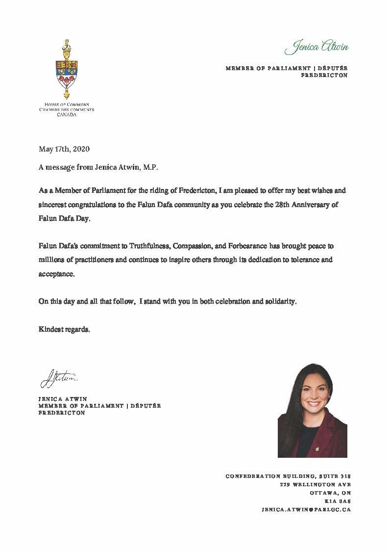 国会议员珍妮卡·吐温(Jenica Atwin)贺信中说:作为弗雷德里克顿区(Fredericton)的国会议员,我很高兴能表达我对第28个法轮大法日最诚挚的祝愿。法轮大法对真、善、忍的守护为世界上数百万的修炼者带来和平。