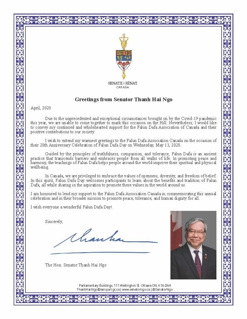 联邦参议员吴蓝海(Ngo Thanh Hai)的贺信如下:鉴于今年Covid-19病毒大流行带来的前所未有的特殊情况,我们无法在国会山举办庆祝活动。但是我仍然想要表达我对加拿大法轮大法协会一如既往的,全心全意的支持。感谢你们对我们社会所作出的积极贡献。