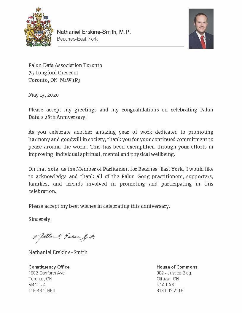 国会议员纳撒尼尔(Nathaniel Erskine-Smith)在致多伦多法轮大法协会的贺信说,请接受我对5.13法轮大法28周年纪念日的祝贺!