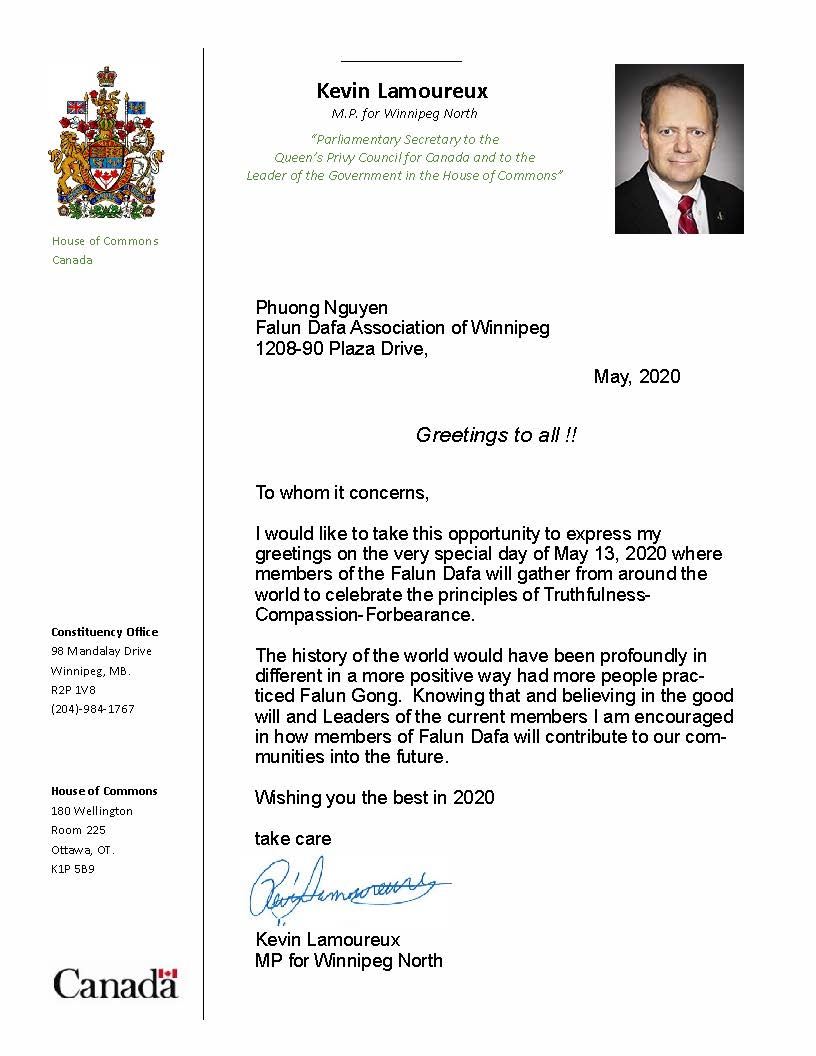 温尼伯北部选区国会议员凯文·拉莫鲁(Kevin Lamoureux )致温尼伯法轮大法协会道:向你们致以节日祝贺!在2020年5月13日这个非常特殊的日子,在全世界法轮大法弟子共贺真善忍普世价值之际,特致以衷心的祝愿。如果更多的人修炼法轮功,那么世界历史的呈现定会更加正面而深刻的不同于今日。基于这项认知,我信任现任法轮大法协会的领导者们,我为法轮大法成员在未来能为我们社区作出积极的贡献而欢欣鼓舞。祝你们2020年吉祥如意!
