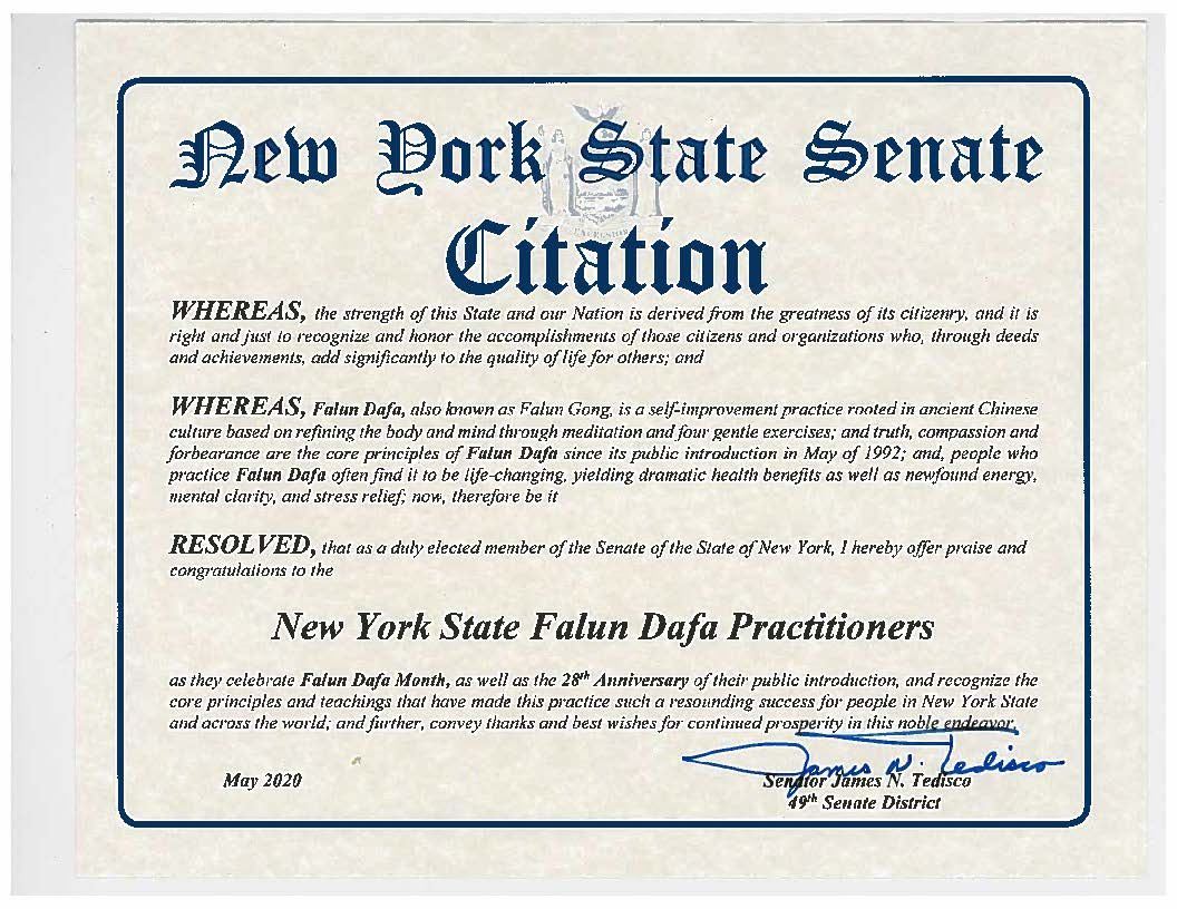 因此,在庆祝法轮大法月暨法轮大法弘传二十八周年之际,作为纽约州参议院的民选议员,我在此赞赏并祝贺纽约州法轮大法学员,法轮大法的原则和教导让纽约州和世界各地修炼此功法的人取得了巨大的成就。我对你们表示感谢,并祝你们在崇高的追求中一切顺利。