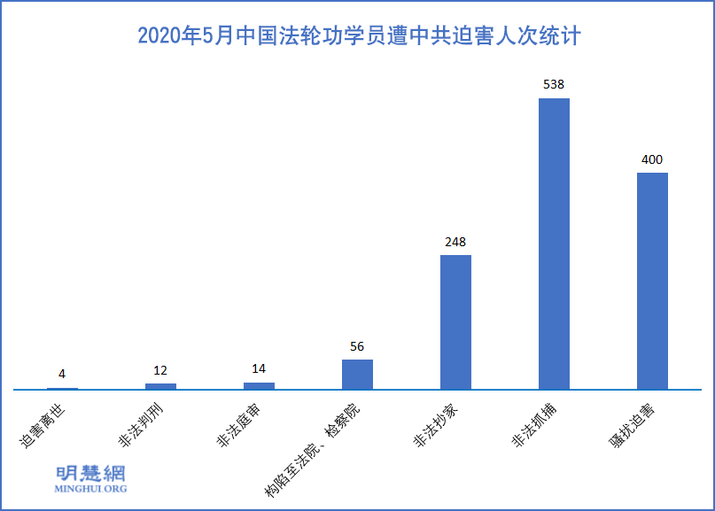 二零二零年五月中共警察非法抓捕538名法轮功学员(228人已经回家,1人走脱。),骚扰400人,抄家248人,送洗脑班26人,被迫离家出走8人,判刑12人,庭审14人,构陷到检察院、法院56人。108名65岁老年法轮功学员被绑架和骚扰,年龄最长者92岁。五月份,安徽省宿州市萧县法轮功学员刘发庭,河南禹州市张志温,吉林省松原市王国珍,辽宁省大连宋淑春四人被迫害致死。