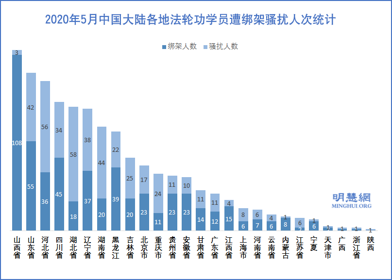 据明慧网信息统计,二零二零年五月份538名法轮功学员被绑架。绑架最严重地区依次是,山西省108人,山东省55人,四川省45人,黑龙江39人,辽宁省37人,河北省36人;贵州省、安徽省23、北京市各23人;湖南省、吉林省各20人。绑架最严重城市依次是,临汾市100人,贵阳市23人,广安市18人,哈尔滨市17人。