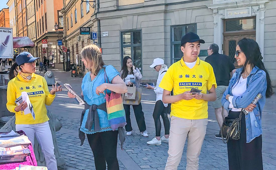 【明慧网二零二零年六月十四日】(明慧记者何平瑞典斯德哥尔摩报道)二零二零年六月十三日周六下午,阳光明媚,瑞典部份法轮功学员与往常一样在斯德哥尔摩市中心国会大厦(Riksdag)旁的钱币广场(Mynttorget)举办讲真相活动,向人们展示法轮大法美好、揭露中共二十多年来造谣污蔑法轮功的事实真相及活体摘取法轮功学员器官的罪恶。